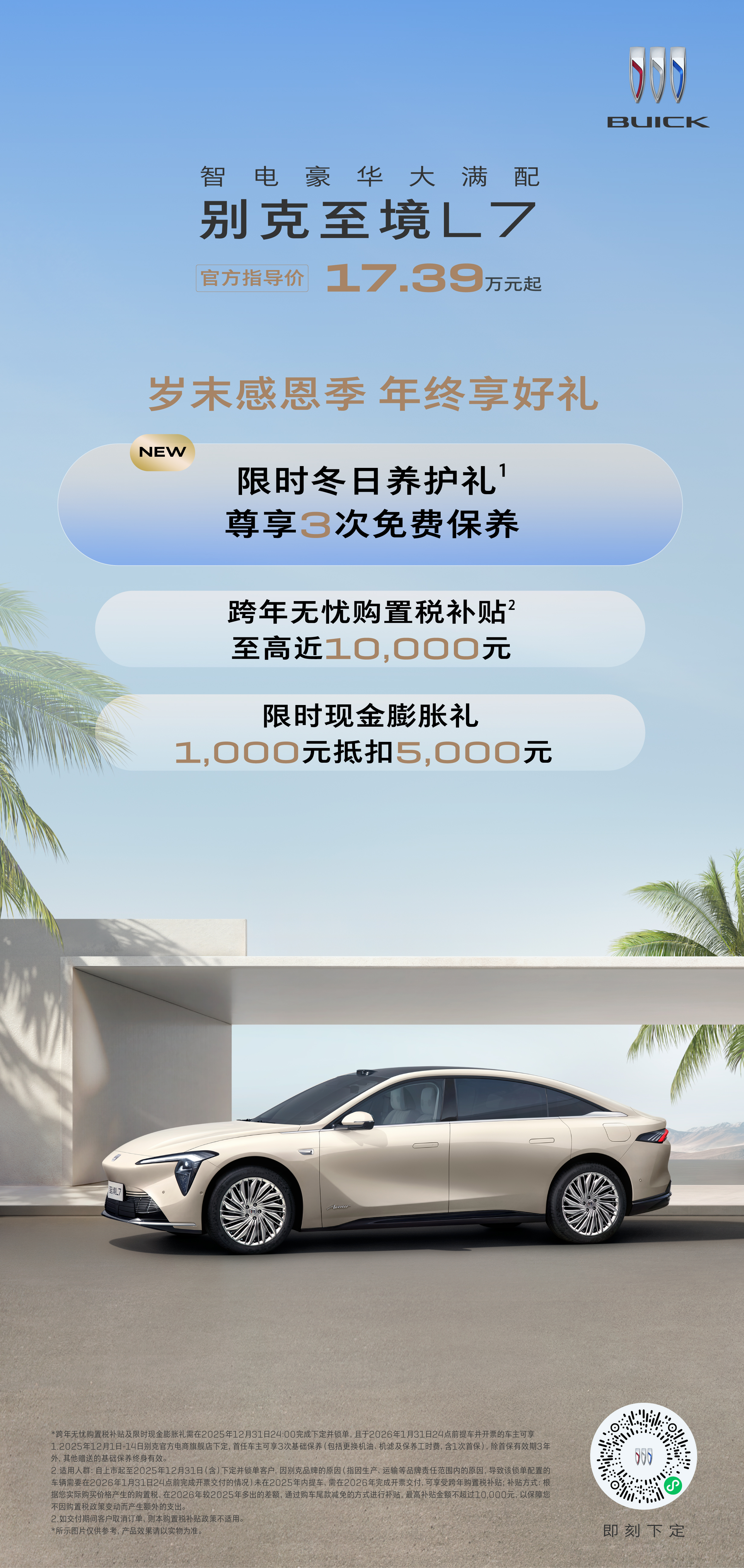 值得一提的是,为回馈用户厚爱,别克至境L7还推出多项好礼:在12月31日之前下定并锁单,即可享至高10,000元跨年无忧购置税补贴,以及1,000元抵5,000元的限时现金膨胀礼;于12月1日-14日在别克官方旗舰店下定,首任车主还可享3次免费保养,为用户带来更多安心与便利。