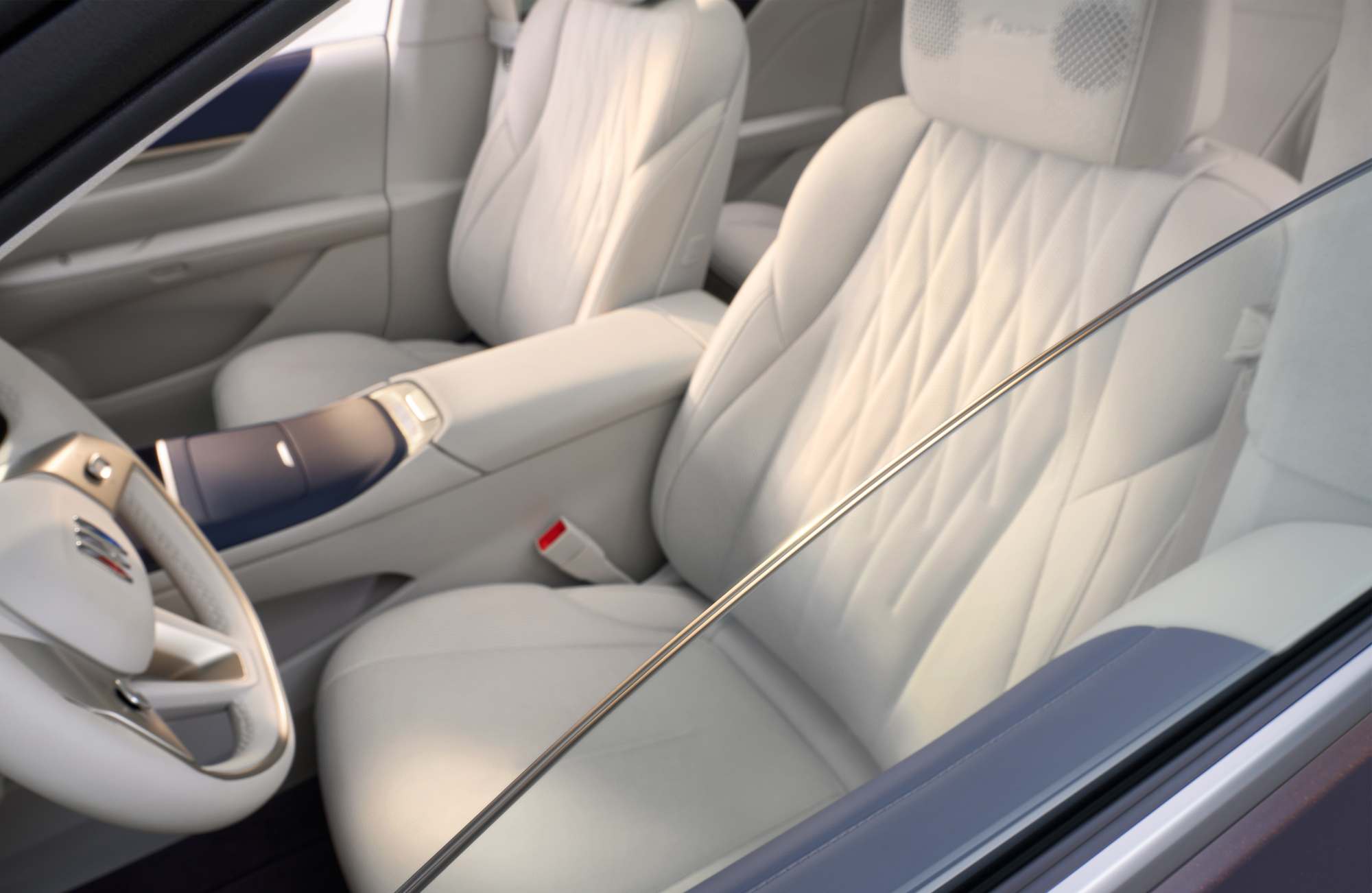 引领新能源时代用户不断升级的审美需求,至境L7的内饰采用全新纯净浮岛设计美学,流畅的线条与曲面交织,更有环绕氛围灯“推波”助势,营造出被海浪轻拥的环抱体验。浮叶式悬浮中控台仿佛水中的轻盈浮岛,全新设计的10.25吋全液晶仪表盘、15.6吋智能中控屏,呈现简洁优雅、势能流淌的错层空间。内饰采用行政级豪华选材,提供贴心周到的270°皮质环绕包覆,所视皆豪华,所触皆柔软。车内门板按钮、座椅靠背以及“水中石”晶雅顶灯等皆采用了源自别克家族徽章的“菱格纹”装饰,以匠心细节点缀豪华品味。星河金砂饰条将仪表台与门板衔接贯通,在阳光下发出如流动贵金属般的柔和光晕,与整体内饰的豪华氛围浑然一体。霞紫月白内饰配色搭配镶嵌哑光电镀饰条的浅色方向盘,将尊贵典雅的东方韵味融入豪华氛围,彰显出内敛且高贵的空间意境。
