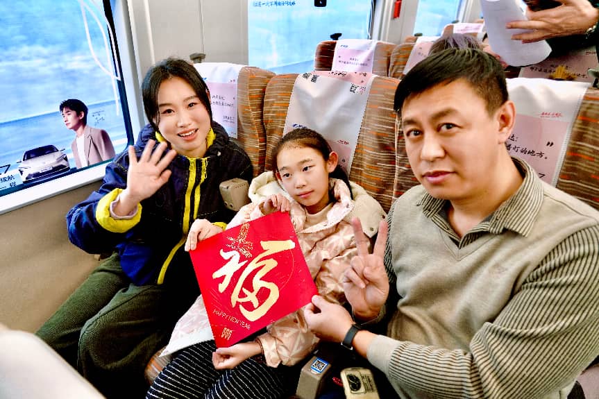 “前几天还在为抢不到票犯愁,刚好赶上活动抢到了票!全家一起回去见见许久未谋面的亲人,开开心心过大年!”乘客孙女士一家难掩兴奋,话语里满是归乡的雀跃。随着列车缓缓开动,窗外风景流转,一个个暖心的瞬间,汇成了归乡路上最动人的风景,每一位旅客都带着期盼与温暖,奔赴那盏等候已久的家灯。
