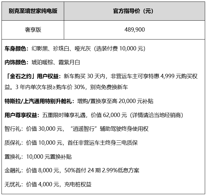 2026年3月17日   今天,别克品牌宣布:旗下首款纯电MPV——至境世家纯电版上市,推出纯电奢享版一款车型,官方指导价48.99万元。至境世家纯电版延续“别墅级新能源旗舰MPV“定位,完整继承插混版车型的硬核实力,更以900V 6C超快充电池、“哑光灰”双拼色高定涂装、“金石之约”用户权益、特斯拉车主专属增换购礼遇等多项行业首发科技与权益,实现纯电出行体验的全面跃升。