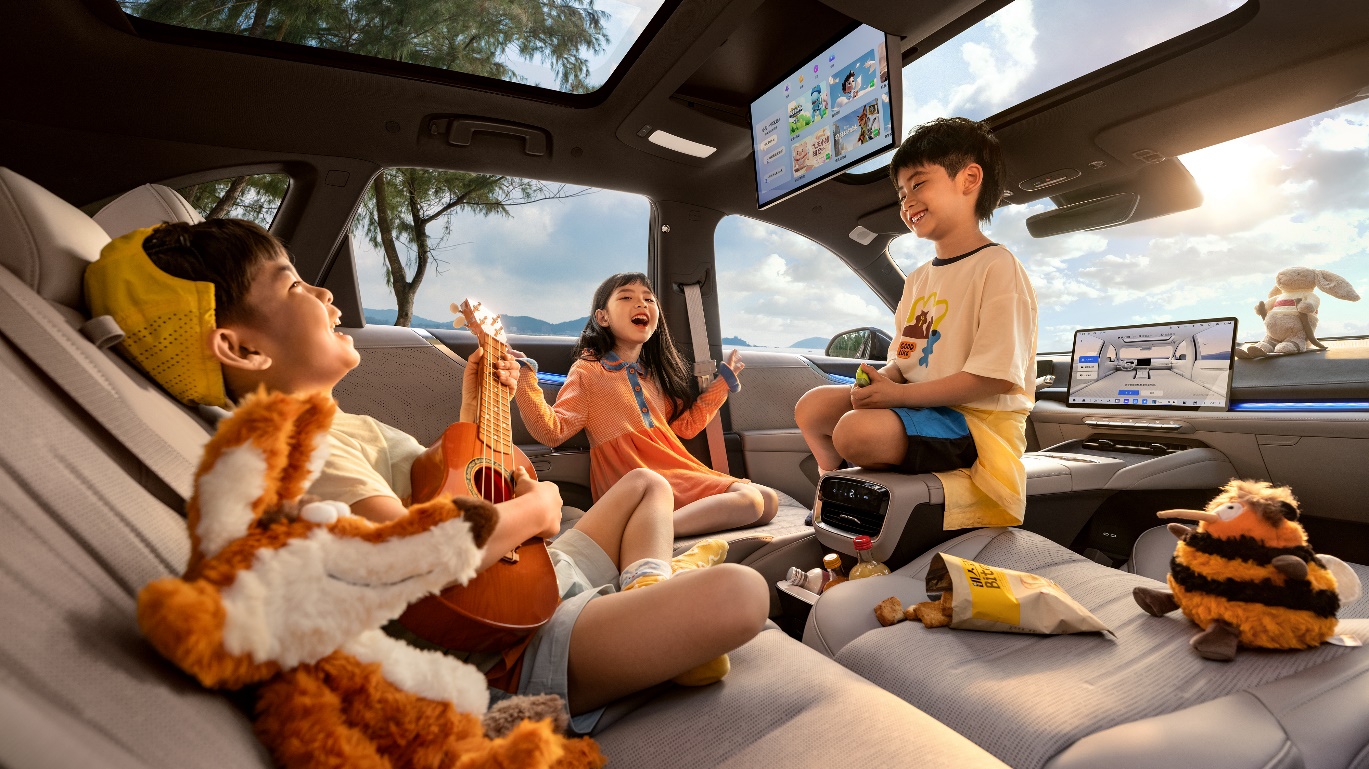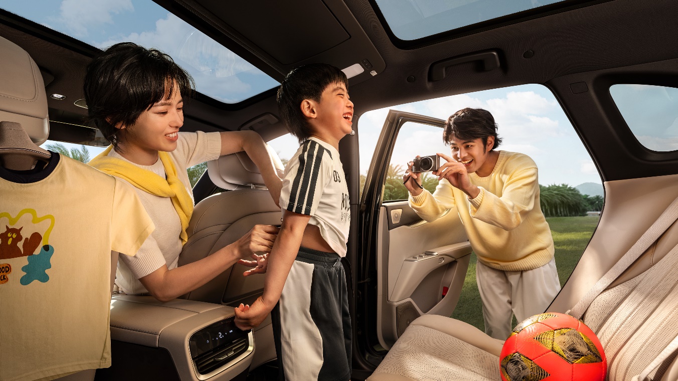 “全景环抱式”座舱以舒展格局营造呵护之感,流畅的线条与圆润的曲面交织,形成包容的空间氛围。座椅与门板饰以水波流转般的细腻纹理,搭配母婴级超柔亲肤材质,触感细腻顺滑,尽显对家人的妥帖守护。内饰甄选云上雅米与松烟紫黑双色,一净雅一深邃,清雅沉稳,让驾乘体验更上佳境。