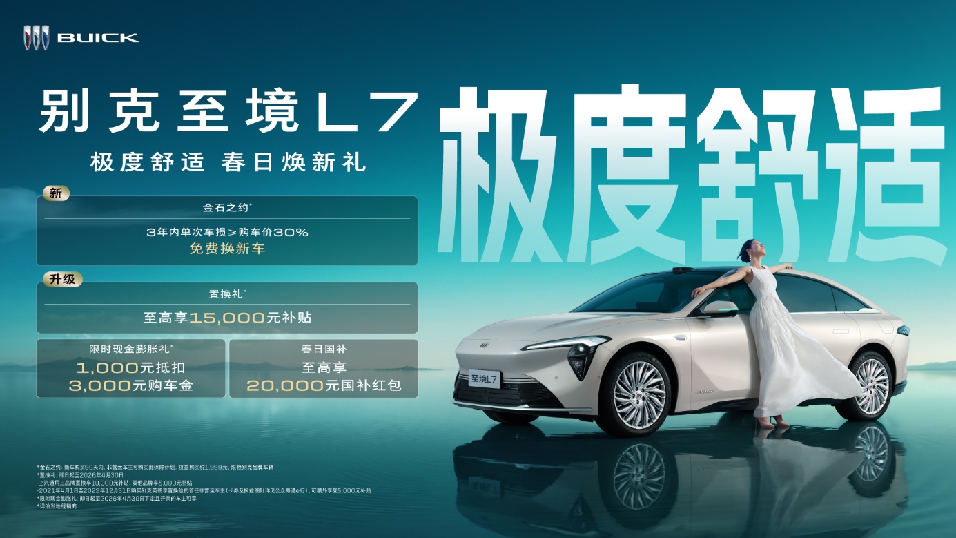 在实现用户体验进阶的同时,别克至境L7还发布“春日焕新”权益。推出新能源轿车领域首个重大车损“只换不修”的“金石之约”保障,符合条件的非营运车主,3年内单次事故车损超过购车开票价30%,即可免费置换全新车辆。同步上线的“春日焕新礼”也诚意满满:即日起至2026年4月30日,购车可享至高15,000元置换补贴,可叠加1,000元抵3,000元限时现金膨胀礼(详洽别克授权经销商)。此外,用户还可享至高20,000元“春日国补红包”。从购车到用车,从日常守护到意外保障,别克以贯穿用户全生命周期的确定性体验,让每一份信赖都有保障。